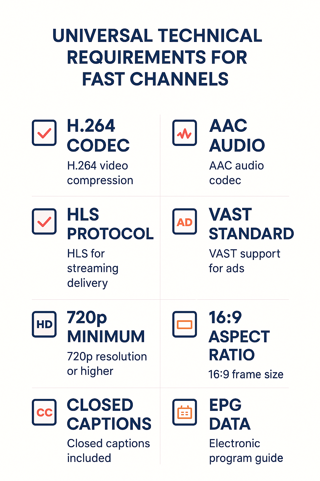 Building a FAST channel that works reliably across platforms isn’t optional—it’s essential. Whilst each streaming platform has unique quirks and preferences, there exists a core set of technical specifications that every platform demands. These universal requirements form the foundation of successful FAST channel distribution, and getting them right from the start saves countless hours of troubleshooting and platform rejections later.